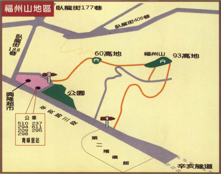 福州山位於台北市東南丘陵間,緊鄰市區,週邊因北二高連絡道、辛亥路、臥龍街而為台北市交通要衝之地,為美化坡地景觀,增添民眾登高賞景據點,提昇鄰近社區休憩環境品質,已規劃闢建為「福州山林園」。 園內第一、二階段開闢面積約八公頃,為營造富變化之生態林園景致,已種植約一萬八千株低海拔原生植物苗木。遊客現可由興隆超市旁小公園後側或辛亥路旁入口,沿枕木步道上山登頂,至六○高地或九三高地有二座觀景平台及涼亭,可鳥瞰市區,很適合一般民眾健行登高賞景。交通可搭乘聯營237、209、295、294、298公車在「青峰里站」下車,再由登山口進入。 爺爺奶奶登山舒適度: